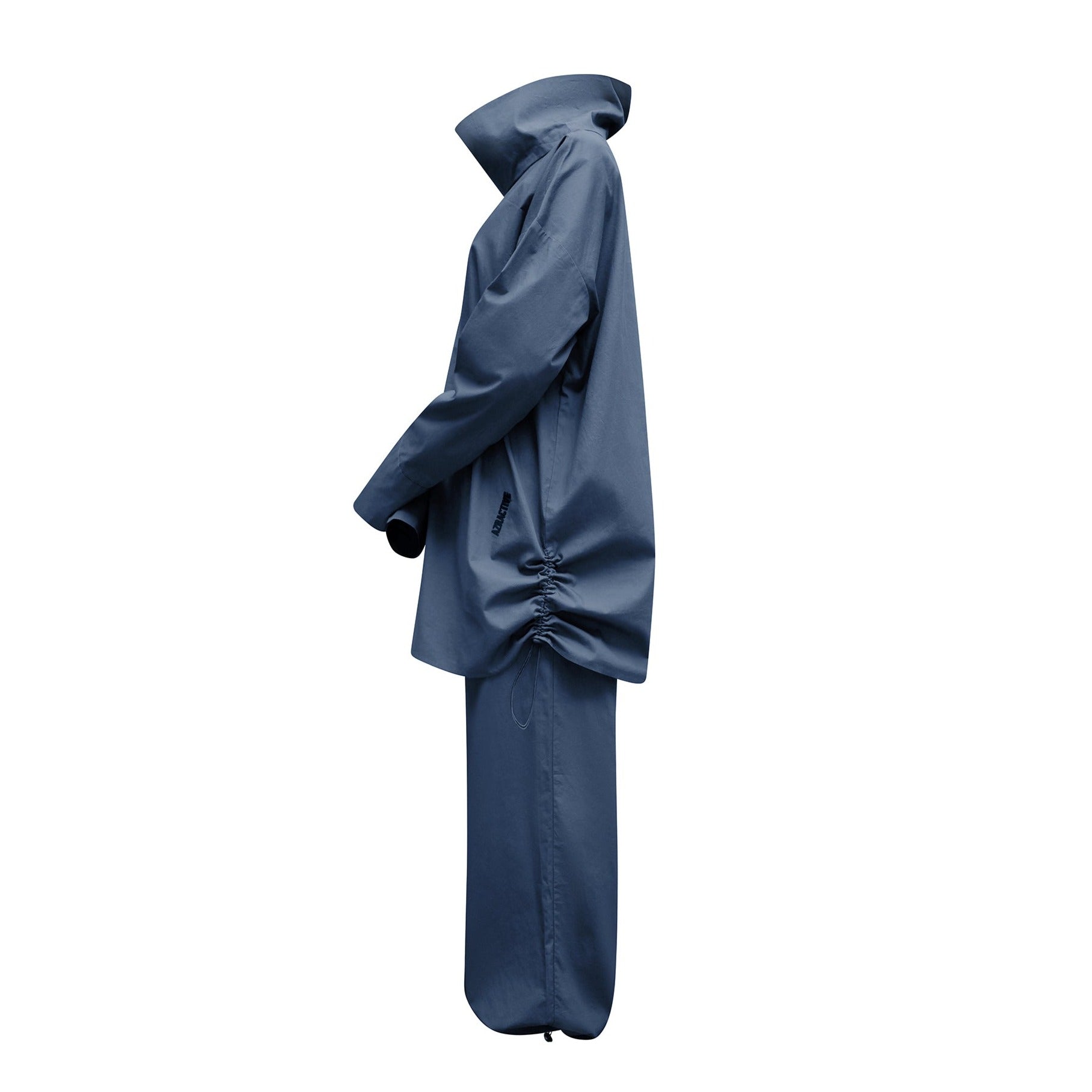 This ocean blue shirt is long, loose and breathable, with toggles on the side to adjust the length.