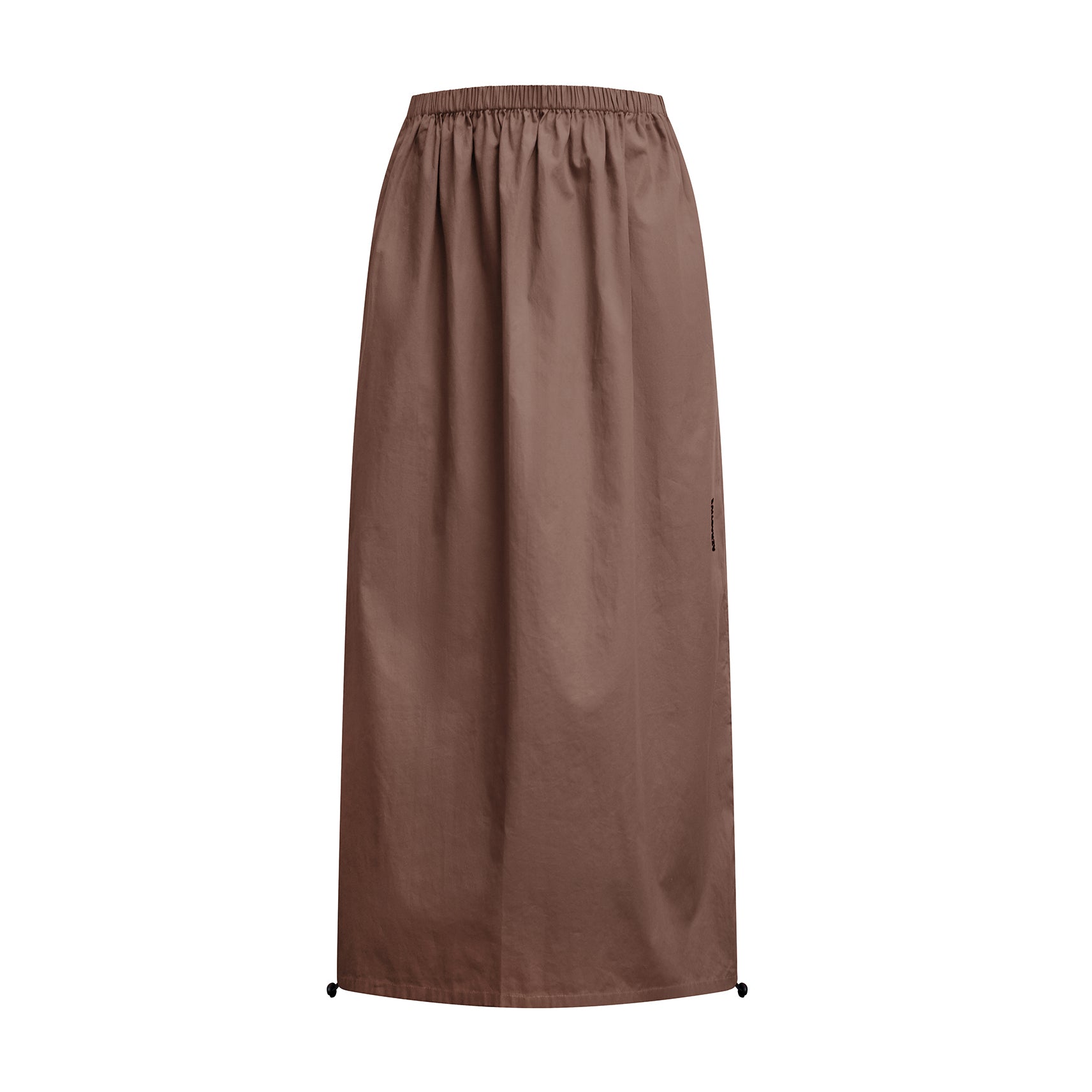 This long taupe skirt has toggles at the ankle to adjust the length.